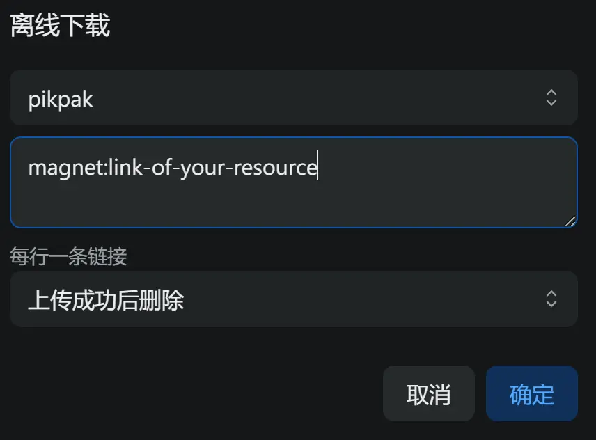 在弹出的对话框中,复选框选择pikpak,下方填写你需要下载文件的链接,每行一个。然后确定即可。