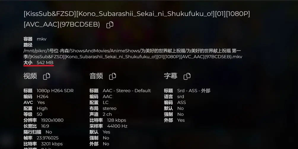 每条目影片、音乐都可以在详情页看到具体的文件大小。由于关闭了服务端转码,每个视频或音频都会不经任何二次压缩传输至客户端。