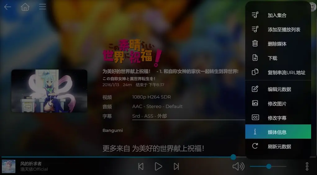 若您对文件大小感兴趣,可以在每个剧集、电影或音乐的详情页菜单中,查看媒体信息: